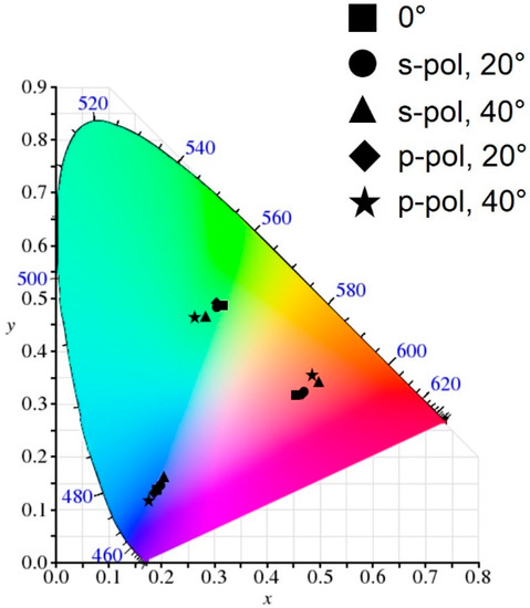 Summary of color coordinates for different angles of incidence (0°, 20° and 40°) and different polarizations (s- and p-polarized light).
