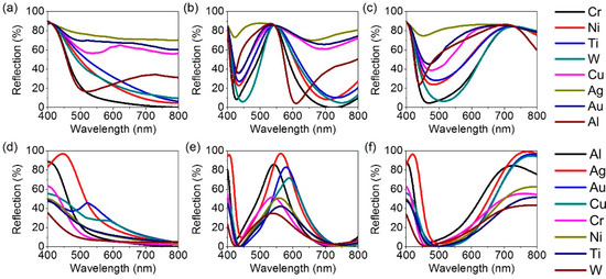 Calculated reflection spectra with different (a–c) top and (d–f) bottom metallic layers at normal incidence for blue, green and red colors.