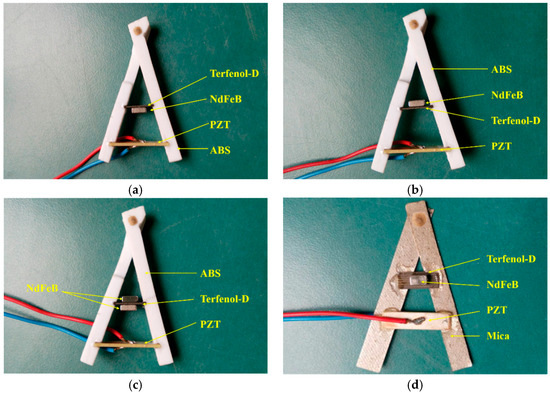 Photograph of the A-line shape Terfenol-D/PZT-5A structure with NdFeB magnets (a) ABS- case; (b) ABS+ case; (c) ABS+- case; (d) Mica case.
