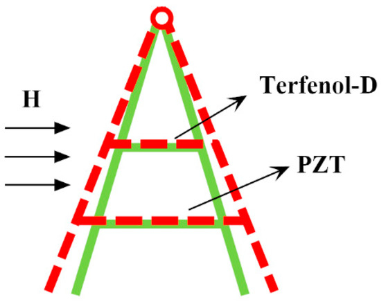 The working principle of A-line shape ME structures is shown in Figure 2. When the ME structure was in an external magnetic field, the Terfenol-D layer elongated along the length direction due to the magnetostrictive effect. Because the ends of the Terfeonl-D and PZT layers were fixed on the trestle, the large PZT layer could be driven by the small Terfenol-D layer, and it also elongated. The deformation of the PZT layer caused a polarization electric field because of the piezoelectric effect. The ME coupling process of the whole ME structure was completed.