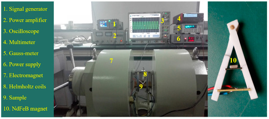 In general, the applied magnetic field included DC and AC parts in the ME experiment. The DC magnetic field was usually provided by an electromagnet and a power supply, see Figure 3. Their volumes were large, which increased the size of the ME devices and added a potential noise source. In our experimental tests, instead of an electromagnet and a power supply, the DC magnetic field was generated by the NdFeB magnet with a smaller size (5 × 3 × 2 mm3).