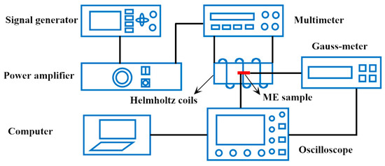 The experiment was carried out under normal temperature. The testing of the ME structure was completed on the ME comprehensive testing system, as shown in Figure 4. This test system was mainly composed of excitation of magnetic field signal and acquisition of output signal. The experimental setup is presented as follows. Firstly, place the sample in the center of the Helmholtz coils. Secondly, an AC signal is generated by a signal generator (ATF208, Atten, Shenzhen, Guangzhou, China) and inputted to a power amplifier (HFVA-62, Yingpu Magnetic Technology Development Co. Ltd., Changchun, Jilin, China). Then the input frequency is adjusted ([0, 200 kHz]), and the output voltages of the ME structures are measured with an oscilloscope (Agilent DSO9064A). Finally, the ME coefficient can be calculated by the definition , where VP−P is the peak-to-peak value of the output voltage, HAC is the virtual value of the AC magnetic field, and tp is the thickness of PZT layer [50].