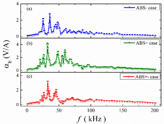 Firstly, the relation between the ME coefficient and frequency has been studied for the ME structures with ABS and mica trestles. Here, the alternating magnetic field was 79.6 A/m. The frequency changed from 0 to 200 kHz. Figure 5a–c shows the ME coefficient versus frequency for the ME structures with ABS trestles when the permanent magnet was put in different places. It is clear that a multi-peak phenomenon appeared in the ME structure. Table 1 shows the number of peaks and the resonance frequencies for the ME structure with and without NbFeB magnet. The data without NbFeB magnet comes from the study of Zhang et al. [34]. The DC magnetic field was 79.6 kA/m, which was provided by an electromagnet and a power supply (see Figure 3). For the ME structure with NbFeB magnet, multiple resonance peaks appeared in the frequency range 0–70 kHz. For frequencies over 70 kHz, there was basically no resonance phenomenon. For the ME structure without NbFeB magnet (HDC = 79.6 kA/m), resonance occurred when the frequency exceeded 70 kHz. Besides, resonance frequency also varied in three cases, as shown in Table 1. Moreover, the maximum ME coefficient was different in three cases. For example, the maximum ME coefficient in the ABS- case was 2.724 V/A at 35.6 kHz; for the ABS+ case, it was 4.142 V/A at 32.2 kHz; and for the ABS+- case, it was 3.173 V/A at 32.4 kHz.