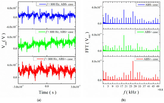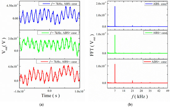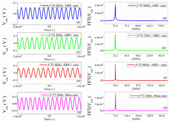 Figure 7 shows the transient response curves of the output voltage Vout for the ME structures with ABS trestles under the low frequency. The input frequency was f = 0.8 kHz. No matter how the permanent magnet was placed on the ME structure, the transient curves were irregular curves. In order to study this condition further, the fast Fourier transform (FFT) was used to analyze the out voltage, as shown in Figure 7b. We observed that the frequencies of the output signals were 0.8 kHz, 2.4 kHz, 4 kHz, 5.6 kHz, etc. In other words, the frequencies of the output voltage were odd multiples of the input frequency. This means that the phenomenon of multiple frequencies appeared. Besides, it can be found that the frequency 15.2 kHz (19 times the input frequency) took up a great portion of the whole output frequencies in ABS- and ABS+ cases, and the frequency 21.6 kHz (27 times the input frequency) accounted for a higher percentage in the ABS+- case. Then we measured the output voltage for the ME structure with mica trestles and found the same phenomenon in this structure; the frequencies of 2.4 kHz (3 times the input frequency) and 20 kHz (25 times the input frequency) have large portions, as seen Figure 8.