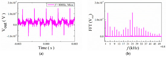 (a) Waveforms of ME voltage in time domain for the ME structure with mica trestles at 0.8 kHz; (b) the FFT spectral pattern for ME voltage.