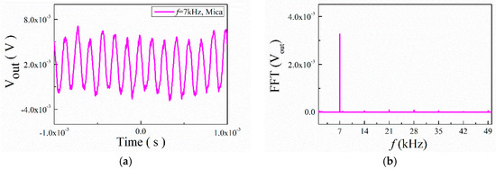 (a) Waveforms of ME voltage in the time domain for the ME structure with mica trestle at 7 kHz; (b) the FFT spectral pattern for ME voltage.