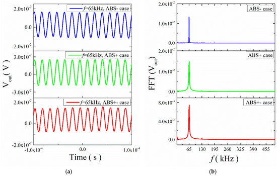 Then we investigated the transient ME response for the ME structures with mica trestles and ABS trestles under a higher frequency (f = 65 kHz). The results, shown in Figure 11 and Figure 12, indicate that the time domain waveforms changed in a sinusoidal fashion. The frequencies of the output signal were all 65 kHz, which is the same as the input frequency. It shows that under high frequency excitation, the response frequency of the structure was consistent with the applied frequency, and the frequency multiplication disappeared in the higher frequencies.
