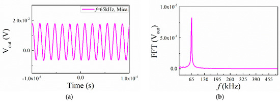 (a) Waveforms of ME voltage in the time domain for the ME structure with mica trestle at 65 kHz; (b) the FFT spectral pattern for ME voltage.