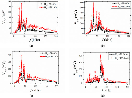 After that, we studied the influence of AC magnetic fields on the ME effect in the ME structures. In our experiments, the AC magnetic field was provided by a pair of Helmholtz coils. For the restrictions in the existing experimental conditions, the magnitude of the AC magnetic field could not reach a high value when the frequency was over 100 kHz. Here, the AC magnetic field was set to 79.6 A/m and 159.2 A/m, respectively. The frequency dependence of the ME voltage is shown in Figure 14. It was observed that the ME voltage at 159.2 A/m was higher than that at 79.6 A/m. The maximum of Vp-p researched 590 mV in the ABS+ case at 159.2 A/m. There were many resonance peaks in the frequency domain [0, 100 kHz]. The frequencies of the peak value of Vp-p were basically the same at 79.6 A/m and 159.2 A/m. For the ME structures with mica trestle, it can be seen that compared to the case at 79.6 A/m, the case at 159.2 A/m had a wider frequency domain.