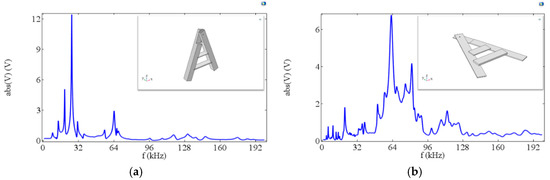 To explain the phenomena mentioned above, a finite element modeling analysis based on a commercial software COMSOL Multiphysics was performed for the A-line shape structures. Figure 15 shows the relationship between the output voltage and frequency for the A-line shape ME structure with ABS and mica trestles. The results show that both types of ME structures had multiple resonance frequencies. For the structure with ABS trestles, multiple common peaks appeared at 0–70 kHz. For the structure with mica trestles, the output voltage remained at high values in the 60–80 kHz range, which is consistent with the experimental results [34]. The existing theory shows that the effective material parameters (such as effective elastic modulus and effective piezomagnetic coefficient) of Terfenol-D materials change under the action of a magnetic field [51]. When a NdFeB permanent magnet is added to the structure, it may affect the performance of Terfenol-D due to a non-uniform magnetic field around it; hence, the addition of NdFeB may change the resonant frequency of the entire structure. This is one reason why the measured resonance frequency changed when the permanent magnets were placed at different positions in the experiment.