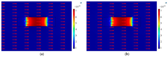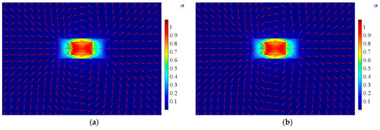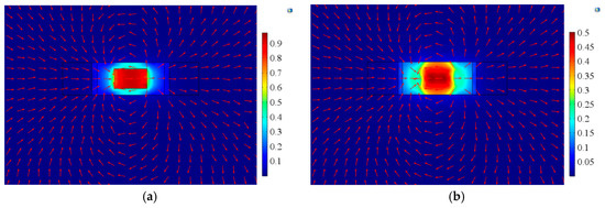 Figure 17 shows the magnetic flux distribution of the two surfaces of the Terfenol-D layer under one NdFeB permanent magnet, corresponding to the case of Figure 1a,b,d in the experiment. Figure 17a shows the magnetic flux distribution near one side of the permanent magnet, and Figure 17b shows the magnetic flux distribution away from the side of the permanent magnet. It can be seen that the magnetic field distribution around the permanent magnet was non-uniform. In the case of Terfenol-D, the magnetic field near the permanent magnet position was large, and the magnetic flux distribution in the entire Terfenol-D layer was uneven. In addition, since the two surfaces of Terfenol-D were different from the position of NdFeB, the magnetic flux distributions of the two surfaces were also different.