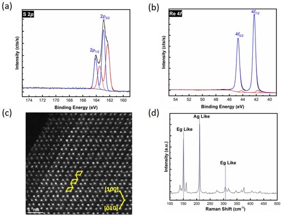 (a) S 2p and (b) Re 4f X-ray photoelectron spectroscopy (XPS) core level spectra obtained on a freshly exfoliated ReS2 surface. The additional component in the lower binding energy is shown in red for both spectra. (c) High-angle annular dark field (HAADF) presents only Re atoms and (d) Raman spectrum of exfoliated ReS2.