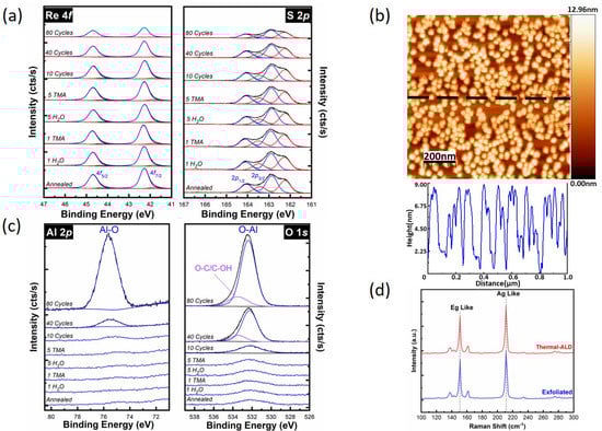 Figure 2b shows a topographic image obtained by AFM of Al2O3 on ReS2 following 80 full cycles employing the thermal ALD process. After the thermal ALD on ReS2, an islanding growth is observed because of the relative dearth of dangling bonds on 2D TMD surfaces [25,26]. The AFM line profile shows that the height of these Al2O3 islands is ~8 nm, with a root mean square (RMS) surface roughness of 2.7 nm.