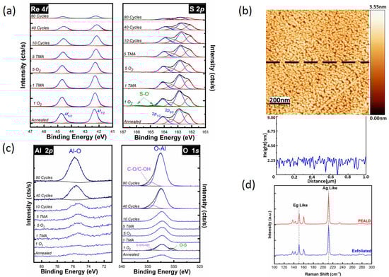 Plasma-enhanced atomic layer deposition (PEALD) of Al2O3 on ReS2. (a) The evolution of (a) Re 4f and S 2p core level spectra, (b) Ex-situ AFM image and line profile recorded following 80 cycles PEALD of Al2O3, (c) Al 2p and O 1s core level spectra up to 80 cycles of Al2O3, and (d) Raman spectra recorded on exfoliated ReS2 and after 80 cycles of PEALD of Al2O3.