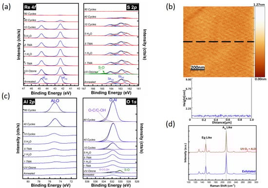 Deposition of Al2O3 using thermal ALD on functionalized ReS2 surface by UV-Ozone exposure. (a) The evolution of Re 4f and S 2p core level spectra, (b) Ex-situ AFM image and line profile recorded following 80 cycles PEALD of Al2O3, (c) Al 2p and O 1s core level spectra up to 80 cycles of Al2O3, and (d) Raman spectra from exfoliated ReS2 and after 80 cycles of Al2O3 on UV-Ozone treated ReS2.