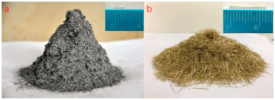 AH-70# base asphalt obtained from Hubei Guochuang Hi-tech Material Co., Ltd., of China (Yichang, China) was used in this paper. Steel wool fibers provided by Jiangsu Golden Torch Metal products Co., Ltd (Yancheng, China) and Dramix steel fibers provided by Bekaert Corp. (Brussels, Belgium) were used as the heating units for asphalt mixtures and asphalt binders via induction heating, respectively. The morphology of the two kinds of fibers are shown in Figure 1, and the properties of bitumen, steel wool fiber, and Dramix steel fiber are shown in Table 1. The optimal content of fibers was 6% by the volume of asphalt according to previous researches [4]. Asphalt mixture with 6% steel wool fibers had the best mechanical properties (highest strength and particle loss resistance) and acceptable induction heating speed. Basalt aggregate and limestone filler were used in this study.