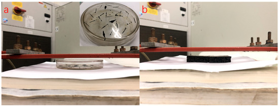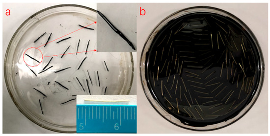To better study the effect of high temperature produced via induction heating on asphalt binder aging, Dramix steel fibers were immersed into the heated asphalt to obtain the asphalt-fiber samples wrapped by 0.5 mm asphalt film, which were prepared for an FTIR test and FCA test, as shown in Figure 2a. For DSR test, it needed more asphalt, 3.9 g asphalt was poured into a glass dish with a diameter of 9.35 cm to obtain 0.57 mm asphalt film. The number of Dramix steel fibers was 100 to ensure adequate induction heating ability, as shown in Figure 2b.