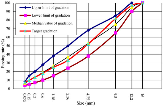 Figure 3. Grading curve of AC-13 steel wool fibers modified basalt asphalt mixture.