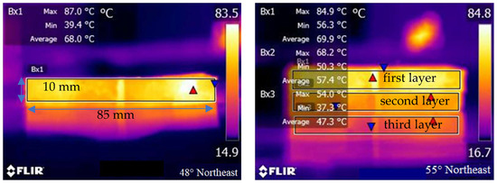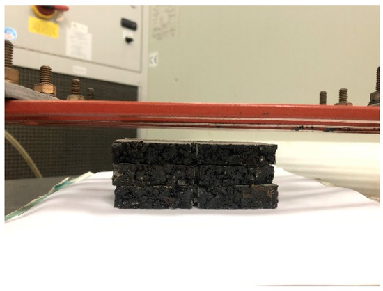 The power needed for induction heating is dependent on the conductivity and size of the specimen used for the test. Figure 5 shows the induction heating test of Dramix asphalt-fibers and asphalt concrete, corresponding to power 8.8 kW and 8.4 kW, respectively. The frequency of the induction heating apparatus was always 123 kHz. The distance between the coil and the surface of the specimen has a significant influence on the heating speed. The distance used in this paper for all samples was 10 mm according to the preliminary study [4], as shown in Figure 5. The induction heating times were 10 s for Dramix asphalt-fibers and 40 s for asphalt concrete while the corresponding temperature was 85 °C, which had proven to be the best temperature for induction healing in previous studies [15]. An infrared image camera with a resolution of 320 × 240 pixels was used to detect the temperature of the samples during induction heating, as shown in Figure 6. After each induction heating, the samples had enough time to recover to ambient temperature before starting the next induction heating test. Additionally, the phenomenon of the gradient temperature during induction heating had been demonstrated in previous studies [11,24], so in this paper, the gradient aging during induction heating was studied, and the three beams were stacked together, as shown in Figure 7. For all induction heating tests, once the surface average temperature reached 85 °C, the induction heating was stopped. For the three-layer beams induction heating test, to amplify the effect of gradient on the asphalt binder aging, the sample was heated 10 times in all, still giving the sample a full time to return to ambient temperature after each induction heating. In this paper, all Dramix steel fibers samples were induction heated 1 time. Pure asphalt (PA), as a contrast sample, was also conducted with FTIR, DSR, and FCA test. The test summary is shown in Table 2.