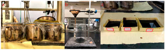 Figure 10. Extraction process of asphalt binder in asphalt concrete: dissolution (a), filtration (b), and volatilization (c).