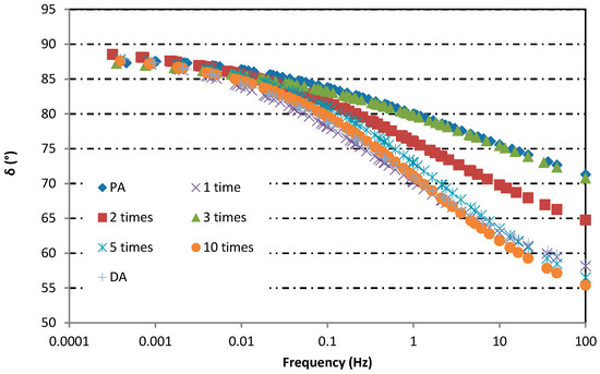DSR (MCR101, Anton Paar, Graz, Austria) was applied to investigate the rheological properties of extracted asphalt binder previously. Frequency sweep test was performed in the range of 40 to 76 °C. Seven temperature levels were measured at intervals of 6 °C. At each temperature level, the frequency scanning range was 0.1~100 Hz. To ensure the uniform temperature of the specimen, the temperature equilibrium time of the asphalt specimen at each sweeping temperature was 3 min. A plate with 25 mm diameter and 1 mm gap were used. According to Liu et al.’s research [27], the master curve was simulated through the logPen. model.
