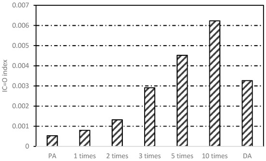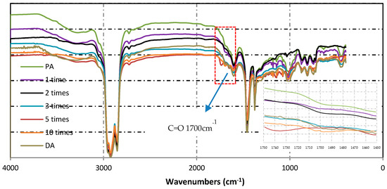Figure 14 shows the changing areas of carbonyl functions and Figure 15 presents the changes in FTIR index of asphalt binders obtained from different induction heating conditions. From Figure 14, it can be observed that with the increase of induction heating times, the carbonyl index in asphalt binder increased gradually, but there was no peak value. For pure asphalt, IC=O was 0.000531, which was far below the value of other samples, indicating that slow aging occurred during production and storage. After induction heating for 10 cycles, IC=O reached to 0.006231, which demonstrated that the asphalt binder aging was very obvious at this time. However, for DA, its carbonyl index was equivalent to the value of the asphalt binder inside the asphalt concrete after inducting heating for three cycles, which was more serious than that after induction heating for one and two cycles. This showed that in the case of more oxygen, the asphalt binder did incur more serious thermal oxygen aging during induction heating, and in the meantime, the relatively closed space in asphalt concrete could restrain the aging.