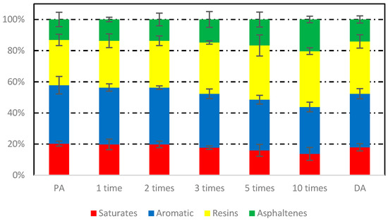 Figure 17 shows the component fractions of asphalt binders after induction heating in different conditions. Significant changes of four component fractions of different asphalt binders took place. After induction heating for 10 cycles, the fractions of saturates decreased from 20.29% to 13.69%, and the fractions of aromatic decreased from 37.53% to 30.16%, while the fractions of resins increased from 29.08% to 35.82%, and the fractions of asphaltenes increased from 13.10% to 20.33%. From Figure 17, the trend of components changes showed that the number of induction heating cycles was the decisive factor. The change of component fractions may be due to volatilization of light components (saturates and aromatic) or transition of light components to weight components at high temperature. In addition, the component fractions of DA were similar to that of the asphalt binder after induction heating for 3 cycles. This may be because open space was more conducive to the volatilization of light components, thus, avoiding the reattachment of volatile light components to the interior of asphalt concrete.