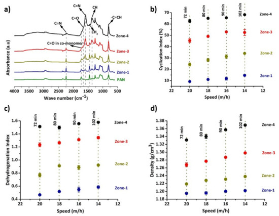 Figure 2b,c show an increase in the cyclization and dehydrogenation indices during thermal treatment from Zone-1 to Zone-4 at each speed. Similarly, at each zone, samples processed at higher dwell times showed higher values of the indices indicating the increase in thermal stabilization with respect to time. For example, at the end of Zone-4, samples treated for 102 min (14 m/h line speed) exhibited a cyclization index 6% higher than the Zone-4 sample treated for 72 min at 20 m/h line speed. Overall, it is evident that the higher the dwell time, the higher the cyclization and dehydrogenation indices, indicating a higher progress of thermal stabilization. This is further supported by the trends shown by the density of samples from each zone as shown in Figure 2d. These observations suggest that the chemical structural transformations in the polymer backbone promote the increasing compactness in the structure, resulting in denser fibres, which is in good agreement with previous observations [16,18,34].
