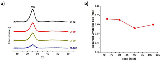 X-ray studies were conducted on carbon fibres obtained from various residence times during thermal stabilization. Figure 3a shows the XRD patterns of fibre samples, where it is evident that in all the samples there is a peak at diffraction angle ~25.5° corresponding to a crystallographic plane (002) [21,31]. The existence of this peak indicates the evolution of a turbostratic graphitic structure in all carbon fibres. During carbonization, the ladder polymer structure in stabilized fibres is transformed to a planar structures by means of crosslinking with the loss of heteroatoms, usually nitrogen and oxygen [31]. These planar structures stack into layers, due to π–π interactions, and further evolve as crystallites. Based on these peak parameters, an apparent crystallite size (Lc) of all fibres was calculated using Scherrer’s equation and is shown in Figure 3b. An overall decrease in the apparent crystallite size from 1.661 nm to 1.599 nm for the samples treated for 72 min (line speed: 20 m/h) and 102 min (line speed: 14 m/h) during thermal stabilization was observed. Interestingly, by comparing Figure 2 and Figure 3b, it is evident that the fibres with lower density, cyclization index and stabilized for shorter dwell times possessed higher apparent crystallite size. Also, it is interesting to note that the carbon fibres manufactured at a line speed of 20 m/h spent 3.84 min in carbonization which was less than 14 m/h sample but possessed larger crystallite size. The thermal treatment of PAN fibres at higher dwell times led to a higher cyclization and formation of these cyclic structures have a tendency to promote oxidation in the polymer structure [37]. Moreover, in our previous work the formation of bridging oxygen in the fibre structure was proposed [7], considering the affinity of oxygen towards cyclic structures and our previous proposal, it can be suggested that the fibres treated for 102 min could have higher extent of bridging oxygen atoms which might have hindered the crosslinking mechanism and further led to smaller crystallites during carbonization. Moreover, the structure attained by the fibres treated at 72 min during thermal stabilization should be sufficient to provide more reaction sites for further crosslinking of ladder polymer structures in to planar structures compared to 102 min samples.
