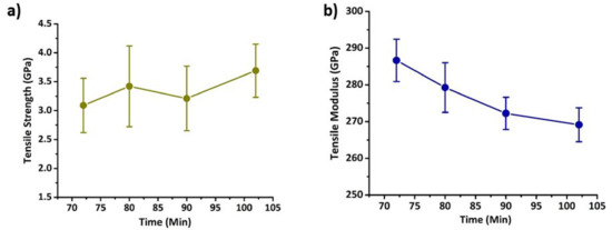 In contrast, an opposite trend can be observed for the tensile modulus as shown in Figure 4b. The modulus of fibres treated for 72 min during thermal stabilization was 17 GPa higher than the carbon fibres manufactured from precursor stabilized for 102 min. The increase in modulus is generally associated with the orientation of the crystallites in the fibres, however, Liu et al. [38] mentioned that together with the orientation, the apparent crystallite size also play a critical role in influencing the tensile modulus of fibres. Based on the current results, it can be depicted that the increase in modulus is associated with an increase in crystallite size in respective fibres, which is evident by comparing Figure 3b and Figure 4b. Moreover, 72 min of thermal stabilization of PAN fibres for the considered temperature profile could have been enough for the efficient crosslinking of the ladder polymer structures and further might have led to stiffer structures without significantly affecting their orientation during carbonization.