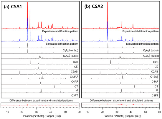Rietveld refinement results of (a) CSA1 and (b) CSA2 cements.