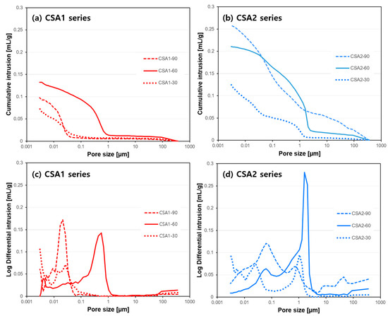Results of mercury intrusion porosimetry (MIP) at 28 days: cumulative intrusion of (a) CSA1 and (b) CSA2 series and log differential intrusion of (c) CSA1 and (d) CSA2 series.