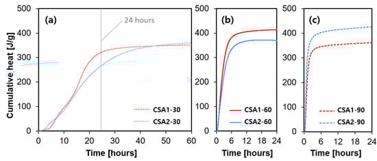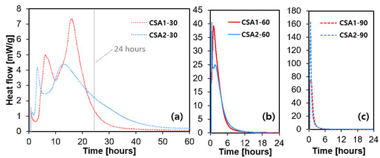 The heat flow evolution of CSA pastes is shown in Figure 6. Note that the ordinate scale changes in Figure 6 with changing curing temperature. At the curing temperature of 30 °C, two main peaks were observed. The two peaks initiated earlier in the CSA2-30 sample, but the peaks of CSA1-30 have higher intensity than those of CSA2-30. This is due to the acceleratory effect of calcium sulfate on ye’elimite hydration. In general, as the curing temperature rose, the maximum rate of heat flow (i.e., the height of the main hydration peak) significantly increased and occurred earlier. It is interesting to note that CSA1-60 emits more heat than CSA2-60, while the opposite occurs at the curing temperature of 90 °C, as shown in Figure 7b,c. Moreover, the heat released at 24 h by CSA2 increased with an increasing curing temperature. However, the heat released at 24 h by CSA1 increased from 30 °C to 60 °C, but decreased from 60 °C to 90 °C. This might be explained by the endothermic reaction of the decomposition of ettringite at higher temperatures [24,25], considering the condition (i.e., external mixing) of the conduction calorimetry measurement. This phenomenon also explains the lower compressive strength of CSA1 at 1 day with a curing temperature of 60 °C compared to 90 °C.