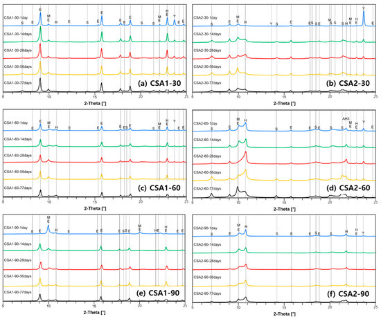 Measured X-ray diffraction patterns of each samples cured at (a,b) 30 °C, (c,d) 60 °C, and (e,f) 90 °C. Symbols of E, M, H, S, and Y indicate ettringite, monosulfate, hemicarboaluminate, and ye’elimite, respectively.