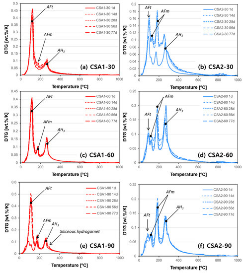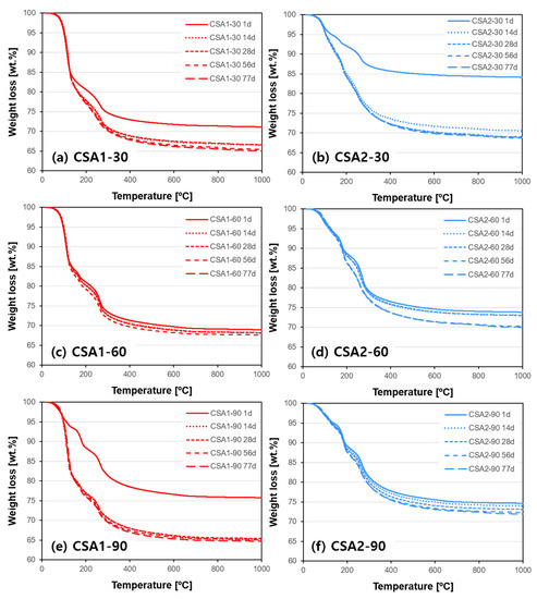 The TGA and DTG results are presented in Figure 9 and Figure 10, respectively. Hydration stopped paste samples with identical curing ages used for XRD were measured. Overall, the weight loss increases with curing age in all paste samples but detail trends are quite different depending on the type of CSA cement and curing temperature. In the cases of CSA1-60, CSA2-60, and CSA2-90, relatively small increases in weight losses over time in Figure 9c,d,f explain the stable compressive strength of them from 1 to 28 days (Figure 3), since this is indicative of low hydration activity. On the other hand, CSA1-30, CSA1-90, and CSA2-30 present significant gains of compressive strength from 1 to 28 days (Figure 3). The strength gain in theses samples can be explained by the additional hydration reactions occurring over time confirmed in Figure 9a,b,e for CSA1-30, CSA1-90, and CSA2-30, respectively. Similar trends with more information on hydration phases can be confirmed in the DTG data (Figure 10). In agreement with the XRD results, the DTG analysis shows less ettringite (AFt) and more AFm type phases forming in the lower M-value CSA2 pastes. Finally, when curing at 90 °C a siliceous hydrogarnet peak can be observed in the DTG results for CSA1 and CSA2. This result is in agreement with Dilnesa et al., who observed that siliceous hydrogarnet formed under hydrothermal curing conditions [44]. Although XRD results did not indicate the dissolution of C2S at 1 day, either a small amount (below XRD sensitivity) of C2S may have dissolved or the silica could have come from the ye’elimite dissolution, since ye’elimite can accommodate some substitution [45]. A more comprehensive discussion on this observation will be followed with XRD and GEMS interpretations in the Discussion section.