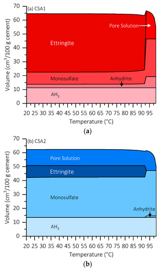 Thermodynamic modeling showing effect of elevated curing temperature on ye’elimite and anhydrite hydration with a w/c = 0.5 for (a) CSA1 and (b) CSA2.