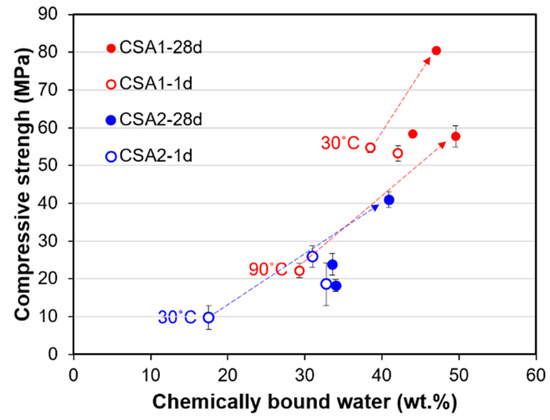 Figure 12 presents the observed inverse relationship between compressive strength at 28 days (filled circle in the figure) and cumulative intrusion measured at 28 days. Regardless of curing temperature, generally large pores in CSA2 led to lower strength. In addition, the lower pore volumes in CSA1 and CSA2 cured at 30 °C yields the highest strengths at 28 days. Considered together with TGA results, there is also a clear relationship between the compressive strengths and the amount of chemically bound water (Figure 13). In other words, the degree of hydration has a direct influence on the compressive strength at 1 and 28 days. Compared to the CSA2 series, the CSA1 series with more anhydrite contained more chemically bound water, including the amount from the re-formation of ettringite after the elevated curing at 1 day. These large increases in the degrees of hydration (as evidenced by the large increases in the TG weight losses) between 1 and 28 days in CSA1-30, CSA1-90, and CSA2-30 clearly contributed to the significant strength gains in those samples (indicated as grey arrows in Figure 12 and Figure 13).