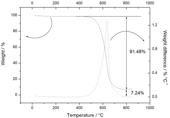 TGA curve (solid line) and weight difference (dash line) for the as-prepared Sn-RGO sample. The thermal analysis was conducted at a heating rate of 10 °C·min−1 from 20 to 850 °C.