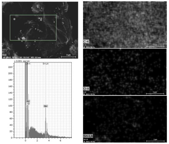 Upper left: Scanning electron microscopy (SEM) micrograph of the Sn-RGO; the rectangle bordered by the white line delimits the area where the EDS analysis was conducted. Lower left: EDS spectrum showing the presence of carbon, oxygen, and tin. Upper right: the white spots mark the presence of carbon. Center right: the white spots mark the presence of oxygen. Lower right: the white spots mark the presence of tin.