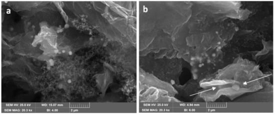 The thermal properties of the Sn-RGO material and the percentage of tin and carbon were determined by TGA. The test was carried out in air at a heating rate of 10 °C·min−1 from 20 to 850 °C. The result of the test is reported in Figure 1. The Sn-RGO sample does not exhibit weight variations up to 400 °C, confirming the absence of labile oxygen-containing groups (alcoholic, carbonyl, or carboxylic). An important change in weight, corresponding to 91.48%, occurred between 550 and 650 °C. Such weight loss was associated with the oxidation of the graphene sheets present in the composite material. The DTA shows a single peak centered at 625 °C. The weight percentage of the final residue was about 7.24%. Since all the metal in the sample was converted into the corresponding oxide, this percentage represents the total tin content expressed as SnO2. Figure 2 (top left) shows the SEM image of the Sn-RGO. The graphene layers were observed as ripples at the bottom of the figure. The layers were partially restacked and wound together, with a structure resembling the exfoliate graphite obtained by heating the natural graphite. Spherical particles were deposited on the surface of the graphene sheets. The particles had a size between 200 and 400 nm and were highly dispersed and not homogeneously distributed on the graphene sheets. The EDS analysis was conducted on the rectangle delimited by the white line. The results are presented in Figure 2 (down left). The EDS allows identification of the presence of tin, carbon, and oxygen. The distribution maps of the three elements are depicted on the right of Figure 2. Since the main constituent of the sample was graphene, carbon was found uniformly distributed in all of the area under observation. Oxygen was uniformly dispersed in the graphene matrix. Tin was also dispersed in the graphene matrix but was also concentrated in correspondence of the spherical particle observed in the SEM image. The spherical particles were probably formed during the heating treatment at 800 °C by segregation of melted tin (the tin liquefaction point was about 232 °C). Figure 3 shows the SEM images related to the electrode material before (Figure 3a) and after (Figure 3b) the galvanostatic tests. The cell was tested for 10 cycles of charge–discharge and disassembled at the end of the last discharge process. In Figure 3a, it is possible to observe the spherical particles of Sn and also the presence of RGO sheets is detected. The image (Figure 3b) showed a more compact material, due to the fact that the surface roughness was reduced. This can be explained by the formation of an interphase between the electrode and the electrolyte caused by the partial degradation of the electrolyte itself. Moreover, the graphene sheets were stacked in multilayer structures with a thickness greater than 200 nm, but also observed was the presence of Sn particles (white arrows) between the graphene sheets, which limited their complete stacking.