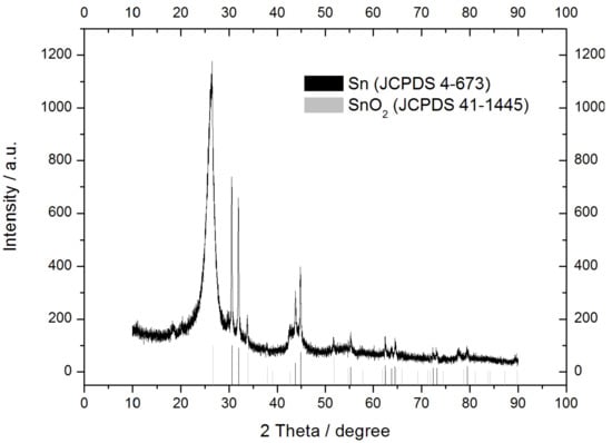 The XRD analysis (Figure 4) gives us information on the crystal structure of the tin present in the material. The peaks shown in Figure 4 can be indexed as belonging to metallic tin with tetragonal structure with space group 141:I41/amd (Joint Committee on Powder Diffraction Standards (JCPDS) no. 4-673) and tin oxide with Cassiterite structure with space group 136:P42/mnm (JCPDS no. 41-1445). The broad peak at 2θ = 26.42° may be attributed to disordered graphene nanosheets [] partially restacked during the high temperature treatment.