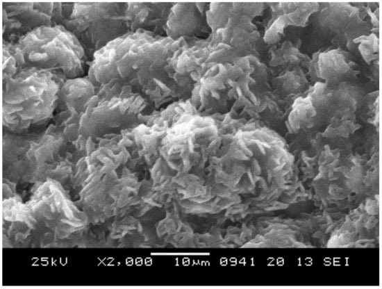Figure 5 shows an SEM micrograph of the Na1.0Li0.2Ni0.25Mn0.75Oδ. It was possible to observe a compact platelet morphology with delaminated layers. This morphology should be attributed to the high synthesis temperature that allows grain growth and porosity reduction. The material appears formed by thin, rectangular primary structures with very jagged edges with length in the range of 3–10 μm. These primary structures were stacked in a disorderly manner. The result was the formation of a secondary structure with rippled and rounded edges, resembling a rose of the desert. The XRD of the material is shown in Figure 6. The reflection peaks were sharp and narrow, thereby indicating a high degree of crystallization. The peaks can be indexed according to the hexagonal P2-structure, space group P63/mmc of α-Na0.70MnO2.05 (JCPDS no. 27-0751). Other small peaks can be attributed to secondary phases [] LiMn2O4 and Na0.58Ni0.33Mn0.66O1.95.