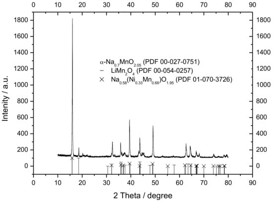 For the synthesis of the material, a variant of the acetate method as proposed by Kalapsazova et al. [] was used. A 2.72 g portion of sodium acetate tri-hydrate (CH3COONa·3H2O, M.W.: 136.08, 0.02 mol, Aldrich), 0.408 g of lithium acetate bi-hydrate (CH3COOLi·2H2O, M.W.: 102.02, 0.04 mol, Aldrich), 1.244 g of nickel (II) acetate tetra-hydrate (Ni(OCOCH3)2·4H2O, M.W.: 248.84, 0.005 mol, Aldrich), and 3.676 g of manganese (II) acetate tetra-hydrate ((CH3COO)2Mn·4H2O, M.W.: 245.09, 0.015 mol, Aldrich) were loaded in a stainless steel vial, together with two stainless steel balls. The vial was mounted in a shaker mill (SPEX 8000, CertPrep, Metuchen, NJ, USA) and milled for 1 h. After milling, the mixture of acetates became liquid. The liquid was transferred to a ceramic crucible, heated in air at 800 °C for 4 h, and left to cool at room temperature.