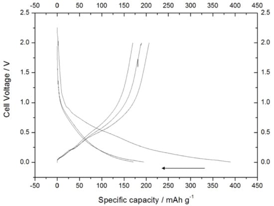Voltage profiles recorded during the first three charge/discharge cycles for the Sn-RGO-based electrode. The cycles were conducted at 60 mA·g−1 between 0.05 V and 2.00 V. The arrow indicates the progression of the cycles.