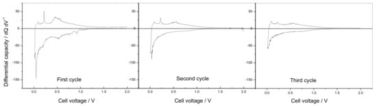 Differential capacity recorded during the first three cycles for the Sn-RGO-based electrode.