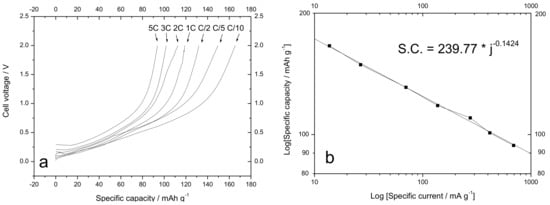 (a) Voltage profiles for the Sn-RGO-based electrode recorded at various charge rates as a function of the specific capacity. The charge rates are reported in the figure. (b) Log–log plot of the specific capacity as a function of the specific current. The equation inside the graph shows the result of the linear interpolation.