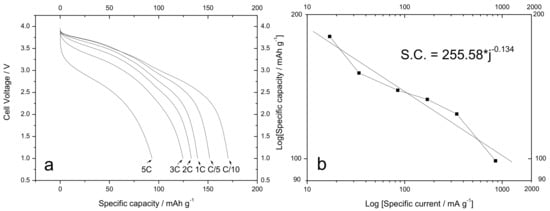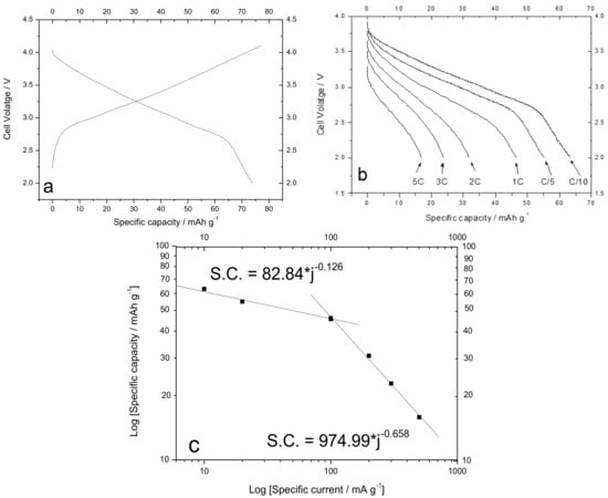 Before assembling the battery, the cathode material (Na1.0Li0.2Ni0.25Mn0.75Oδ) was tested in a sodium half-cell to evaluate its electrochemical properties. The cell was cycled at C/10 rate (0.1 mA) and Figure 11a reports the voltage profiles in charge and discharge. In charge, the voltage rapidly increased from the end charge limit (2.0 V) up to less than 3.0 V. After that, the voltage linearly increased with time. The same behavior was observed in discharge. The specific capacity in charge (about 77 mA·h·g−1) was a little bit higher than the capacity in discharge (about 74 mA·h·g−1) with a Coulombic efficiency of about 96%. The average discharge voltage was 3.14 V. With respect to the analogous material synthesized by Kim et al. [], this material presents a lower specific capacity at low discharge rate, a lower rate capability, and a lower average discharge voltage. The low value of the specific capacity and the low average discharge voltage were disadvantageous for the production of high-energy density batteries. The energy density of the material (about 240 W·h·kg−1) was about one half of the energy density of the materials usually used in LIB technology. Furthermore, in some cases, a parasitic reaction affected the electrode. The parasitic reaction, most likely associated with the oxidation of the electrolyte, avoided the cell to reach the end charge voltage. The appearance of the parasitic reaction was random as some cells had worked for several cycles before the parasitic reaction was established. Instead, in other cases the parasitic reaction started already after the first cycle. This behavior has been repeated in subsequent cycles and also in other cells, confirming a substantial instability of the electrolyte to work with this cathode material. Once again, these findings agree with a more pronounced interfacial instability for SIBs than for LIBs, mainly because of the higher solubility of electrolyte decomposition products (e.g., Na2CO3, which was the main interphase component together with NaPF6) in organic electrolytes with respect to the Li counterparts []. Figure 11a shows the voltage profiles of the Na1.0Li0.2Ni0.25Mn0.75Oδ electrode when cycled at various discharge rates. The electrode was always charged at the lower discharge current (0.01 mA), corresponding to the C/10 rate. At the lower discharge rate, the capacity was a little bit lower than the previously rated capacity (63 mA·h·g−1). By increasing the discharge current, the capacity decreased down to 50 mA·h·g−1 at 1 C rate and to less than 20 mA·h·g−1 at 5 C rate. The average cell voltage decreased from 2.8 V (at 1 C rate) to 2.6 V (at 5 C rate). Figure 8 reports in a log–log scale the specific capacity as a function of the specific current. At specific currents lower than 100 mA·g−1, the loss of capacity with increasing current was quite low: from the linear regression, the power low that relates the specific capacity to the discharge current was S.C. = 82.84 × j−0.126. For higher specific currents, a more severe capacity fading was observed: the pre-exponential factor increased while the exponential factor decreased and the power low assumed the form: S.C. = 974.99 × j−0.658.