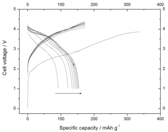 Composite cathode tape was made by roll milling a mixture of 0.4 of active material, 0.0426 g of binder (Teflon, DuPont, Midland, MI, USA), and 0.0906 g carbon (Super P, MMM Carbon, Brussels, Belgium). The electrode tape composition was 75.0 wt.% active material, 8.0 wt.% Teflon, and 17 wt.% carbon Super P. Electrodes were punched from the tape in the form of discs with a diameter of 12 mm. The electrode weight ranged from 12.8 to 30.3 mg corresponding to an active material mass loading of 8.5–20.1 mg·cm−2.