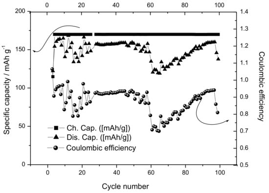 Despite the possible occurrence of the parasitic process, which could profoundly affect the result of the test, a SIB was prepared using the Sn-RGO as the anode and the Na1.0Li0.2Ni0.25Mn0.75Oδ as the cathode. The weight of the anode active material was 5.2 mg. Considering a reversible capacity of 170 mA·h·g−1, the capacity of the electrode was 0.88 mA·h. The weight of the cathode active material was several times larger than the anode (about 26 mg). Considering a reversible capacity of 74 mA·h·g−1, the capacity of the cathode was about two times the capacity of the negative electrode. The cell was cycled between 4.4 V and 1.0 V at a current of 0.088 mA (C/10 rate). A time limit of 20 h was set for the first charge step and of 10 h for the following charge steps. Figure 12 shows the voltage profiles recorded during the test. In the first charge, the cell reached the time limit (20 h) charging about 380 mA·h·g−1. During the following step, only 93 mA·h·g−1 were discharged. In the following charges, the cell always reached the second time limit (10 h) charging 170 mA·h·g−1 (the rated capacity of the anode). In discharge, the capacity slowly increased, reaching about 154 mA·h·g−1 after 10 cycles. From this evidence, it follows that the irreversible process does not run out during the first cycles but it affects the cell throughout its operation. Among the various possible causes of this behavior, the formation of sodium metal on the surface of the negative electrode cannot be ruled out, with a consequent decrease in Coulombic efficiency, but this aspect deserves to be further clarified. Figure 13a shows the voltage profiles for the previously described SIB when cycled at various discharge currents (C/10, C/5, 1 C, 2 C, 3 C, and 5 C). The charge was carried out at the same current rate (C/10 rate). At the lower discharge rate, the cell capacity approached the rated value (170 mA·h·g−1). By increasing the discharge current, the capacity decreased but the decline was not so pronounced: the cell discharged about 80% of the rated capacity at 1 C rate and more than 50% at 5 C rate. Figure 13b reassumes the result obtained in the previous experiment: the specific capacity was plotted as a function of the specific current in a log–log plot. Also, in this case, it was possible to observe that the capacity decreased linearly with the increase of current. From the linear fit, the pre-exponential factor was found to be 255 while the exponential factor of the specific current was found to be 0.134, lower than the value found for the cathode when cycled at high discharge currents. From this evidence, it is possible to state the SIB was not kinetically limited by the cathode since, due to the large amount of cathode material into the cell, the discharge current did not exceed the cathode limiting current. Figure 14 shows the charge–discharge cycling test of the SIB. The weight of the anode was 2.3 mg. Considering a reversible capacity of 170 mA·h·g−1, the capacity of the electrode was 0.4 mA·h. Also, in this case, the SIB was anode-limited: the cathode capacity was at least three times larger. The cell was cycled between 4.4 V and 2.0 V at a current of 0.4 mA (1 C rate) in charge and 0.2 mA (C/2 in discharge). A time limit of 1 h was set in charge. The cell never reached the end charge voltage but the charge was stopped after 1 h, storing the practical capacity (170 mA·h·g−1). In discharge, the cell capacity increased with the cycle number to reach a stable value of about 160 mA·h·g−1 after seven cycles, reflecting a possible anode activation upon cycling probably due to progressive wetting by electrolyte and involvement of surface charge storage domains. In following cycles, the discharge capacity was not constant and the Coulombic efficiency was found to change very suddenly. This behavior can be explained by considering the concomitant presence of an irreversible process in charge, the extent of which randomly varies with the number of cycle. This irreversibility can be ascribed to the low interfacial stability of electrolyte with the cathode. As a consequence, the capacity in discharge was variable, depending on the entity of the irreversible process in the previous charge cycle. Nevertheless, the cell cycled for over 100 cycles with capacities ranging from 120 up to 160 mA·h·g−1.
