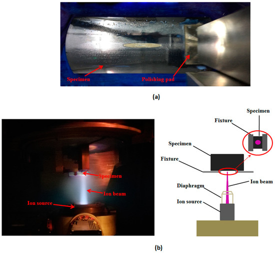 Postprocessing of single crystal silicon mirror: (a) computer-controlled optical surfacing (CCOS) processing and (b) ion beam etching (IBE) processing.